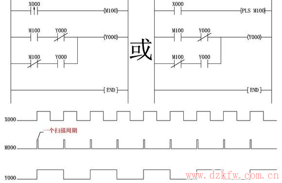 設M100和Y000的初始狀態為0,當X000第一次接通瞬間,上升沿信號到來,M100產生一個掃描周期高電平信號,Y000被置1,Y000的常開觸點閉合,為自保電路做準備,當M100置0時,自保電路接通,Y000仍保持置1;當X000第二次接通瞬間,上升沿信號到來,M100又產生一個高電平信號,M100常閉觸點斷開,Y000的自保電路斷開,使Y000由1變0,M100置0時,Y000仍保持置0,直到X000第三個上升沿信號到來。當X000第一次接通來時,重復上述過程。