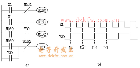 圖中,Y30產(chǎn)生的脈沖信號是X1脈沖信號的二分頻。圖1b中用了三個輔助繼電器M160、M161和M162。當(dāng)輸入X1在t1時刻接通(ON),M160產(chǎn)生脈寬為一個掃描周期的單脈沖,Y30線圈在此之前并未得電,其對應(yīng)的常開觸點處于斷開狀態(tài),因此執(zhí)行至第3行程序時,盡管M160得電,但M162仍不得電,M162的常閉觸點處于閉合狀態(tài)。執(zhí)行至第4行,Y30得電(ON)并自鎖。此后,多次循環(huán)掃描執(zhí)行這部分程序,但由于M160僅接通一個掃描周期,M162不可能得電。由于Y30已接通,對應(yīng)的常開觸點閉合,為M162的得電做好了準備。