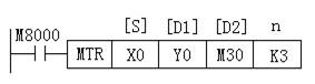 (3)矩陣輸入指令MTR MTR指令的編號(hào)為FNC52。利用MTR可以構(gòu)成連續(xù)排列的8點(diǎn)輸入與n點(diǎn)輸出組成的8列n行的輸入矩陣。如圖3所示,由[S]指定的輸入X0~X7共8點(diǎn)與n點(diǎn)輸出Y0、Y1、Y2(n=3)組成一個(gè)輸入矩陣。PLC在運(yùn)行時(shí)執(zhí)行MTR指令,當(dāng)Y0為ON時(shí),讀入第一行的輸入數(shù)據(jù),存入M30~M37中;Y1為ON時(shí)讀入第二行的輸入狀態(tài),存入M40~M47。其余類(lèi)推,反復(fù)執(zhí)行。