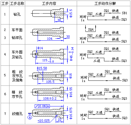 零件加工前為實心坯件,整個機械加工過程由七把刀具分別按七個工步要求,依次進行切削、其加工工步如右圖所示。