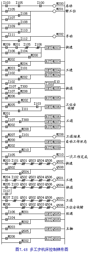 分析動作過程可以發現,大拖板雙速電動機每完成一次工進、快進、工退、快退循環,工位臺就旋轉一個工位進入下一工步。因此,可把該任務分為大拖板雙速電動機控制和工位臺的控制。系統控制梯形圖如圖7.48。