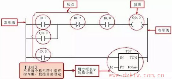 西門子plc梯形圖主要由母線、觸點、線圈或用方框表示的指令框等構成的,如圖1所示。
