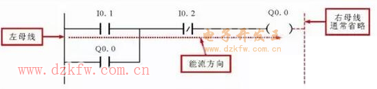 一般情況下,西門子PLC梯形圖編程時,習慣性的只畫出左母線,省略右側母線,但其所表達梯形圖程序中的能流仍是由左母線經程序中觸點I0.1、I0.2、線圈Q0.0等至右母線中的過程,如圖2所示。