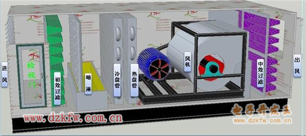 風機鼓入的新風經加熱交換器、制冷交換器、進入房間。