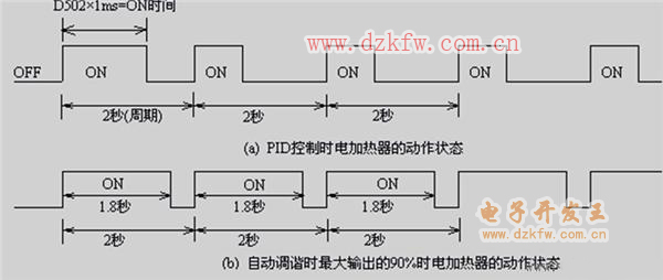 在溫度控制系統中,電加熱器加熱,溫度用熱電耦檢測,與熱電耦型溫度傳感器匹配的模擬量輸入模塊 FX2N-4AD-TC將溫度轉換為數字輸出,CPU將檢測的溫度與溫度設定值比較,通過PLC的PID控制改變加熱器的加熱時間從而實現對溫度的閉環控制。PID控制時和自動調諧時電加熱器的動作情況如上圖所示。