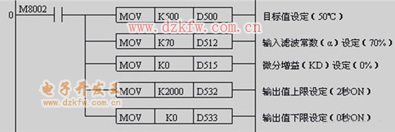 M8002為初始化脈沖,用MOV指令將目標值、輸入濾波常數、微分增益、輸出值上限、輸出值下限的設定值分別傳送給數據寄存器D500、D512、D515、D532、D533。