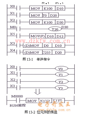 如圖13-2所示,可用MOV指令等效實(shí)現(xiàn)由X0~X3對Y0~Y3的順序控制。