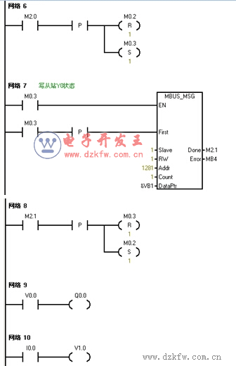 6.完成寫從站Y0狀態(tài)工作后圖3網(wǎng)絡8又觸發(fā)開始讀從站X0狀態(tài)工作,這樣隨著PLC掃描周而復始不斷執(zhí)行對從站讀X0狀態(tài)以及寫Y0狀態(tài)的工作。