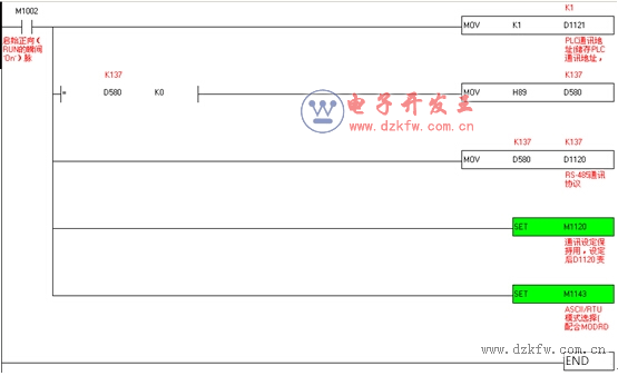 1.對于從站臺達PLC來說,不存在數(shù)據(jù)交換邏輯處理問題,僅僅需要PLC上電第一個掃描周期完成COM2通訊口初始化。即設置COM2通訊口的通訊參數(shù):波特率:9600bps,數(shù)據(jù)長:8位,校驗:無校驗,停止位:2;設置COM2口站號(通訊地址);設置Modbus模式(RTU模式);并且運行期間保持這些參數(shù)不被更新。這個工作熟悉臺達編程參看一下圖4很容易理解。