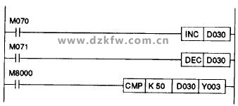 從用戶程序的前面部分,可以檢測車輛進入或離開停車場。這個信息可以通過使用內部線圈和標志,而傳送到程序別的部分。本例中,標志M070和M071代表車進入或離開停車場。當有一輛車進入停車場時,當前停車數量的記錄加1,即對數據寄存器D030的內容執行一個INC指令。
