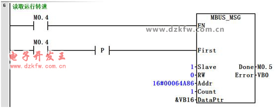 5.編寫(xiě)讀取運(yùn)行轉(zhuǎn)速程序,同理得出運(yùn)行轉(zhuǎn)速地址為16#64A86,程序如圖1-8所示。