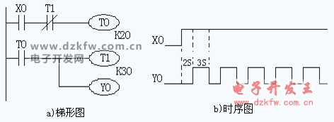 如圖2,為采用兩個定時器產生連續脈沖信號,脈沖周期為5秒,占空比為3:2(接通時間:斷開時間)。接通時間3s,由定時器T1設定,斷開時間為2s,由定時器T0設定,用Y0作為連續脈沖輸出端。
