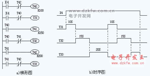 如圖3a所示為用三個定時器產生一組順序脈沖的梯形圖程序,順序脈沖波形如圖3b所示。當X4接通,T40開始延時,同時Y31通電,定時l0s時間到,T40常閉觸點斷開,Y31斷電。T40常開觸點閉合,T41開始延時,同時Y32通電,當T41定時15s時間到,Y32斷電。T41常開觸點閉合,T42開始延時,同時Y33通電,T42定時20s時間到,Y33斷電。如果X4仍接通,重新開始產生順序脈沖,直至X4斷開。當X4斷開時,所有的定時器全部斷電,定時器觸點復位,輸出Y31、Y32及Y33全部斷電。