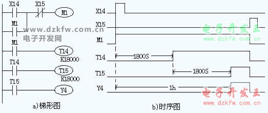 如圖5所示為定時時間為1h的梯形圖及時序圖,輔助繼電器M1用于定時啟停控制,采用兩個0.1s定時器T14和T15串級使用。當T14開始定時后,經1800s延時,T14的常開觸點閉合,使T15再開始定時,又經1800s的延時,T15的常開觸點閉合,Y4線圈接通。從X14接通,到Y4輸出,其延時時間為1800s+1800s=3600s=1h。
