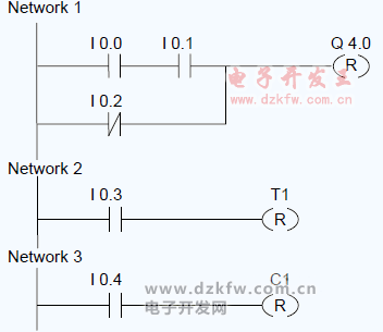 說明:只有在前面指令的RLO為“1”(能流通過線圈)時,才會執(zhí)行---( R )(復(fù)位線圈)。如果能流通過線圈(RLO為“1”),將把單元的指定<地址>復(fù)位為“0”。RLO為“0”(沒有能流通過線圈)將不起作用,單元指定地址的狀態(tài)將保持不變。<地址>也可以是值復(fù)位為“0”的定時器(T編號)或值復(fù)位為“0”的計數(shù)器(C編號)。