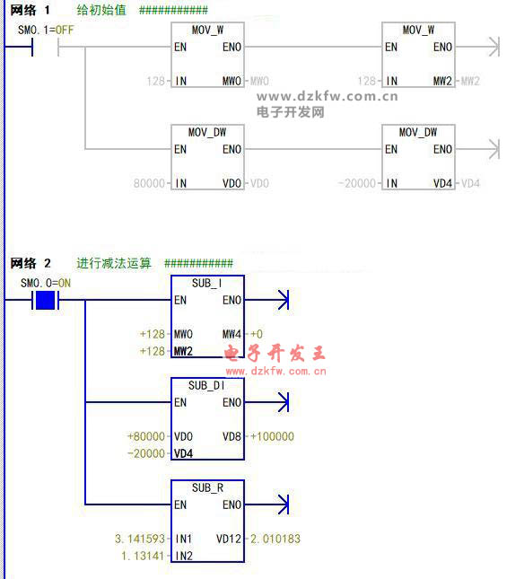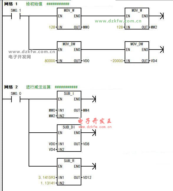 這是西門(mén)子200micro/win軟件中我在主程序中簡(jiǎn)單寫(xiě)的一段程序,網(wǎng)絡(luò)1利用SM0.1給MW0,MW2,VD0,VD4賦予了初始值。網(wǎng)絡(luò)2就是做減法,SM0.0是一直接通的,所以這個(gè)減法就是一直在減。