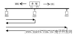 sb3—小車(chē)停止按鈕sq1—左終點(diǎn)行程開(kāi)關(guān) sq2—右終點(diǎn)行程開(kāi)關(guān)。