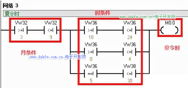 可以根據夏令時對于月的要求、時間的要求,通過比較指令輸出結果暫存在M0.0: