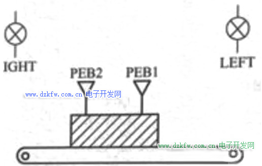 一側裝配有兩個反射式光電傳感器PEB1和PEB2(安裝距離小于包裹的長度),設計用于檢測包裹在傳送帶上的移動方向,并用方向指示燈left和right指示。