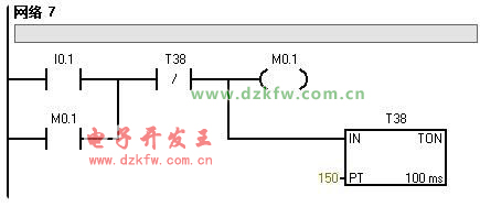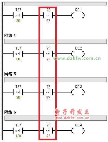 先設(shè)定一個I0.1的啟動+自鎖條件,確保第二個定時器T38滿足啟動條件。然后根據(jù)推算選好設(shè)定值,再按照逆序熄滅的要求,把此前預(yù)留得比較指令的位置,設(shè)定好時間值。