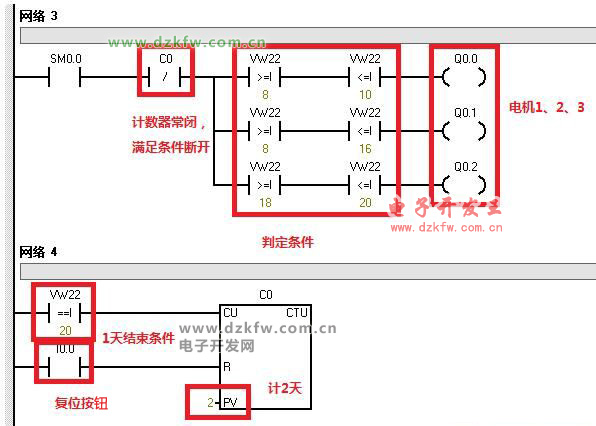 第二天再按照以上要求運行,運行2天后系統停止執行;當按下復位按鈕I0.0后,則程序繼續按要求啟動電機。