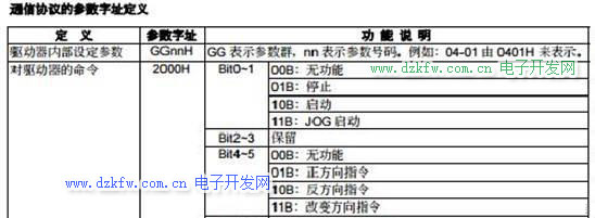 根據下圖臺達變頻器通訊協議的參數,向臺達變頻器2000h地址寫數據01(XX000001)時停止運行,寫12H(XX010010)是正轉,寫22H (XX100010)是反轉。
