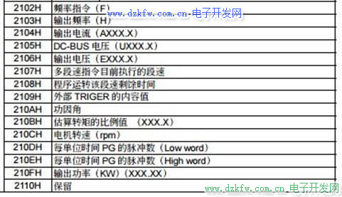 根據臺達變頻器通訊協議向變頻器2103H地址發送03命令可以查詢輸出頻率,向變頻器2104H地址發送03命令可以查詢輸出電流,向變頻器2106H地址發送03命令可以查詢輸出電壓,向變頻器210FH地址發送03命令可以查詢輸出功率,見下表。