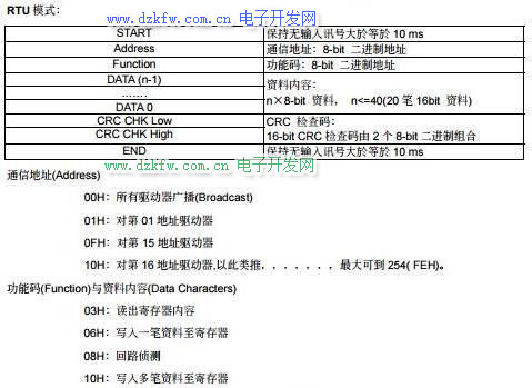 通訊協議:臺達變頻器支持Modbus RTU模式和ASCII碼模式,我們用RTU模式,通訊協議如下圖:例如要查詢地址是01的2102H的數據,需要發送0103210200028FF7,返回01030417700000FE5CH,其中01是地址,03是查詢命令,417700000F是返回的數據8FF7是校驗碼。如果要向變頻器寫數據需要發送06命令,例如發送0106010017708622,向01號變頻器的0100地址寫數據1770,如果操作成功,返回0106010017708622。