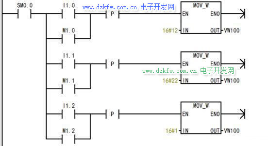 下面程序是通過按鈕(I0.0—I0.2)控制變頻器正轉,反轉和停機。修改變頻器運轉命令,M1.0正轉,M1.1反轉,M1.2,向變頻器2000h單元值寫入1是停止,12是正轉,22是反轉,1是停機。
