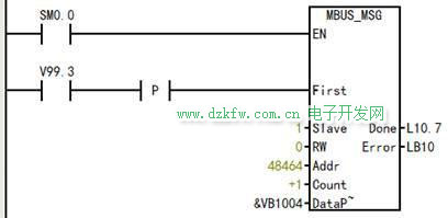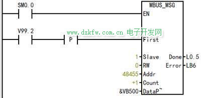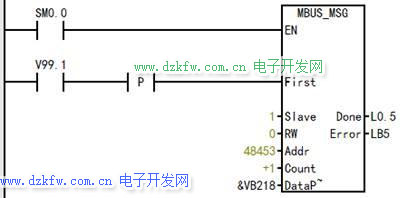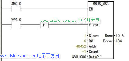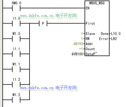 以下為讀變頻器參數,讀變頻器2103H是獲取輸出頻率,讀2104H是獲取輸出電流,2106h輸出電壓,2103h=8451,8451+40001=48452是向2103H讀數據,即讀頻率值,讀出的頻率值送變量存儲器VB1000單元中。