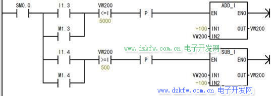 下面程序是按下加速按鈕(I0.3)vw200單元數值增加100,按下減速按鈕(I0.4)VW200單元數值減100.