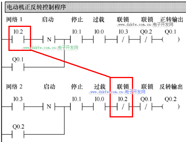 動作是,按下正轉啟動按鈕I0.2時-----I0.2的開點接通----I0.2的閉點斷開---保證先切斷反轉輸出Q0.2-----Q0.2的閉點接通----放開I0.2按鈕時---它的下降沿信號接通----Q0.1輸出接通并自保----實現正轉運行。