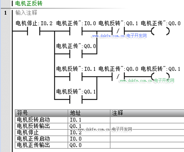 這個電路帶自鎖功能,按下正轉開關后,按反轉開關是沒有反應的,反之也一樣;需要在I0.2開關斷開后再閉合,此時按下正轉或者反轉開關才能切換;