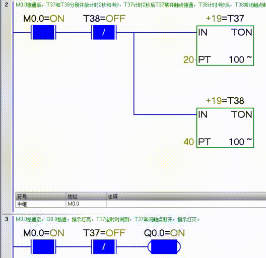 M0.0接通后,T37和T38分別開始計時2秒和4秒,T37計時2秒 后T37常開觸點接通,T38計時4秒后,T38常閉觸點斷開,T37和T38定時器復位,T38用于循環。