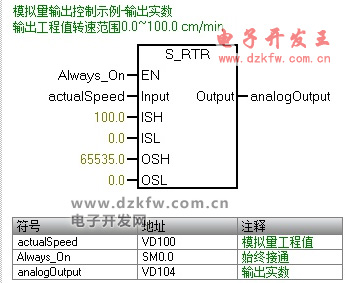 比如西門子 ET200 SP的模擬量輸出模塊AQ 2xI ST,它能輸出4~20mA的電壓信號,其對應(yīng)的輸出整數(shù)的范圍為0~27648。對于這樣的模塊信號轉(zhuǎn)換,我們只需要輸入工程值和轉(zhuǎn)換值即可。舉個例子,某工程值速度信號的范圍為0.0~100.0 cm/min,其實際速度存放在VD100(actualSpeed)中,要求將實際速度轉(zhuǎn)換成相應(yīng)的電流信號進(jìn)行輸出,可以使用下面的代碼: