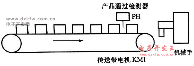 傳輸帶啟動(dòng)按鈕I0.0;傳輸帶停止按鈕I0.1;產(chǎn)品檢測傳感器I0.2;Q0.0接傳輸帶運(yùn)行電動(dòng)機(jī)KM1;Q0.1接機(jī)械手KM2。