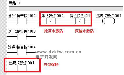 當主持人出題后,沒有按下啟動按鈕I0.0,如有人搶答,則Q0.1報警,選手自己的燈亮,表示選手違規(guī)。
