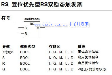 如果R輸入端的信號(hào)狀態(tài)為"1",S輸入端的信號(hào)狀態(tài)為"0",則復(fù)位RS (置位優(yōu)先型RS雙穩(wěn)態(tài)觸發(fā)器)。否則,如果R輸入端的信號(hào)狀態(tài)為"0",S輸入端的信號(hào)狀態(tài)為"1",則置位觸發(fā)器。
