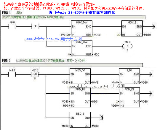 如:連續(xù)20個字存儲器:VW100、VW102....VW138, 其累加之和送入MD0雙子存儲器的程序: