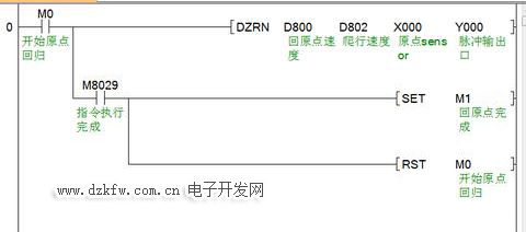 當按下M0的時候,Y0控制的伺服開始回原點,方向默認為當前值寄存器減少的方向,也就是圖中的左方向。其中X0為原點sensor,工作臺先以D800的速度往左移動,當X0感應到工作臺時,再以D802繼續往左移動,知道X0感應不到工作臺時,工作臺馬上停止。此時當前值寄存器會自動清理,回原點指令執行完成。