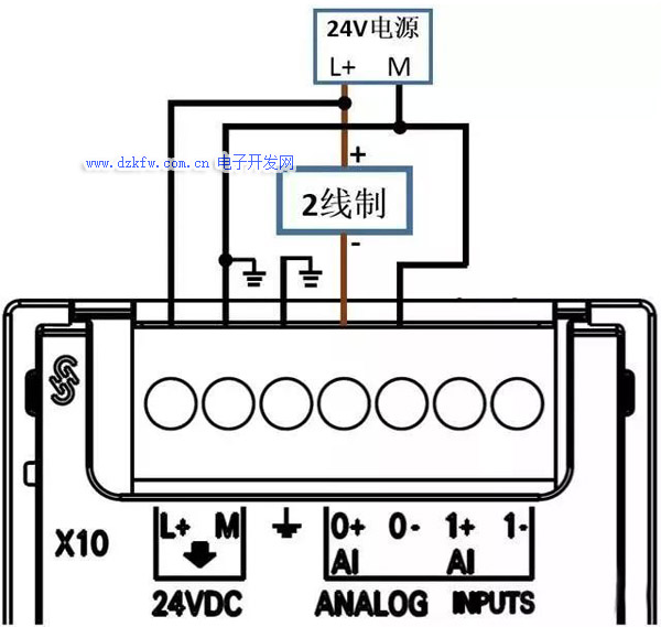 兩線制信號(hào)指儀表或設(shè)備上信號(hào)線和電源線加起來只有兩個(gè)接線端子。模擬量電壓/電流兩線制接線如下圖所示: