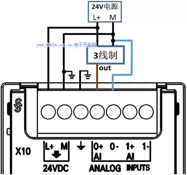 三線制信號(hào)指儀表或設(shè)備上信號(hào)線和電源線加起來有3根線,負(fù)極線與供電電源M線為公共線。 模擬量電壓/電流三線制接線如下圖所示: