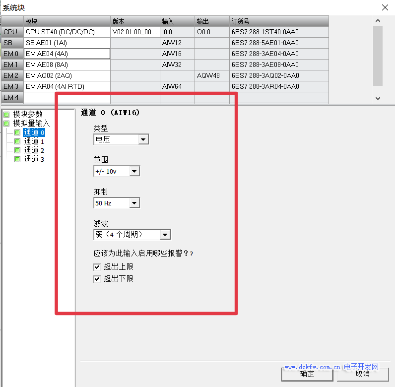 對(duì)于每條模擬量輸入通道,都將類型組態(tài)為電壓或電流。為通道0選擇的類型也適用于通道1,為通道2選擇的類型也適用于通 道3。