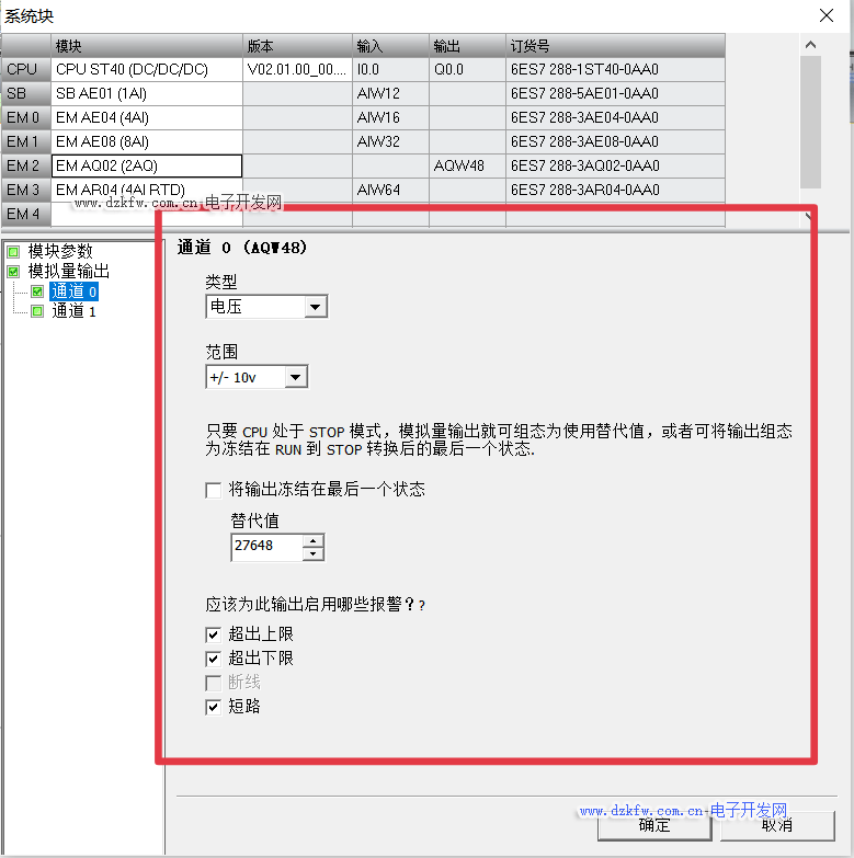 3、單擊'系統(tǒng)塊'對(duì)話框的'模擬量輸出',為選擇的模擬量輸出模塊組態(tài)選項(xiàng)。