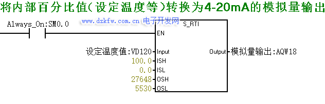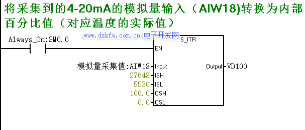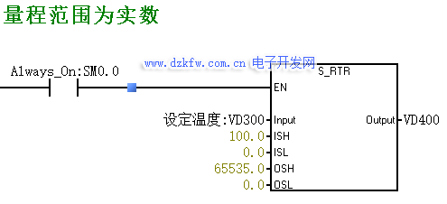 利用西門子模擬量轉(zhuǎn)換庫,安裝后可直接調(diào)用,依次填寫溫度傳感器輸入通道地址,數(shù)字量范圍,工程量范圍(儀表量程),輸出為轉(zhuǎn)換后的工程量(溫度實(shí)際值)。