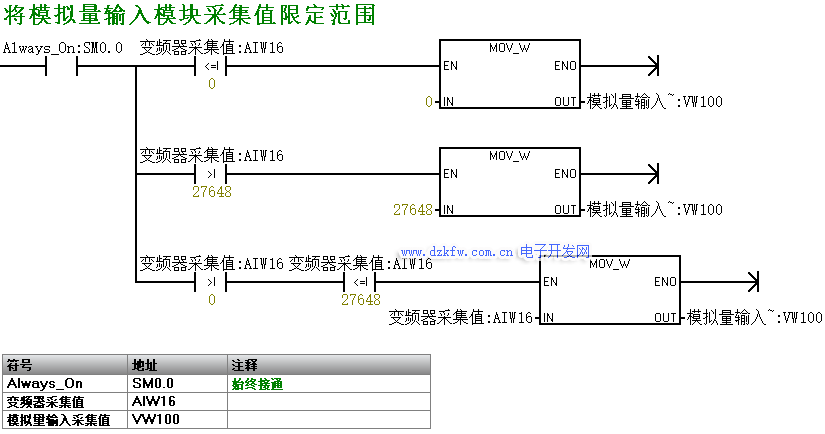 PLC將模擬量值(例如溫度或壓力)轉(zhuǎn)換為一個(gè)字長度(16位)的數(shù)字值,由于模擬量輸入為字,且總是從偶數(shù)字節(jié)(例如0、2或4)開始,所以必須使用偶數(shù)字節(jié)地址,例如AIW0、AIW2、AIW4訪問這些值,模擬量輸入值為只讀。模擬量輸出也是類似,用AQW0、AQW2等訪問,模擬量輸出為只寫值。