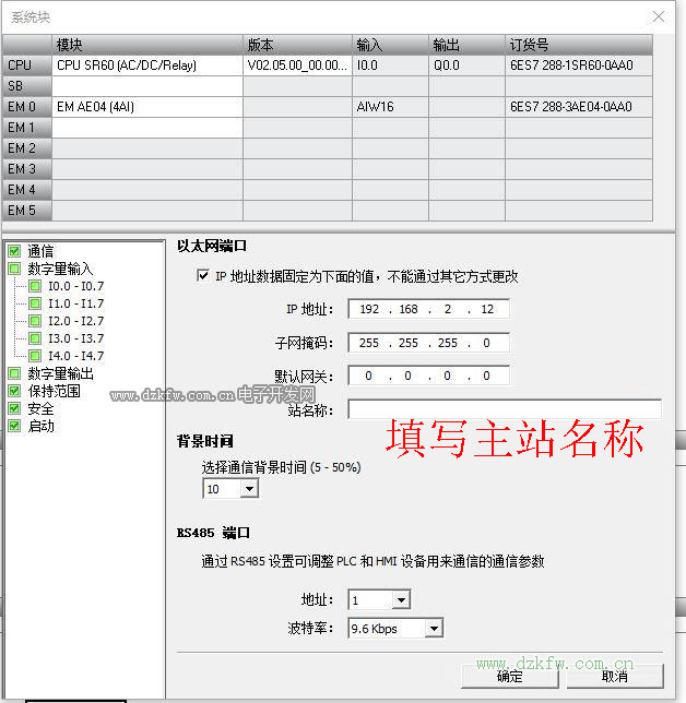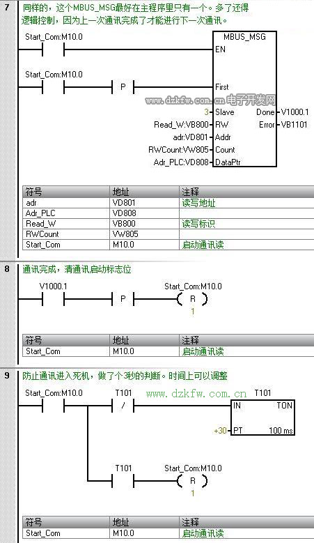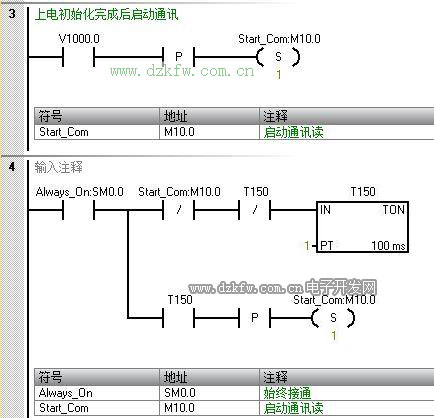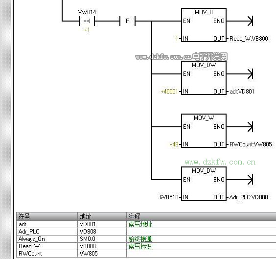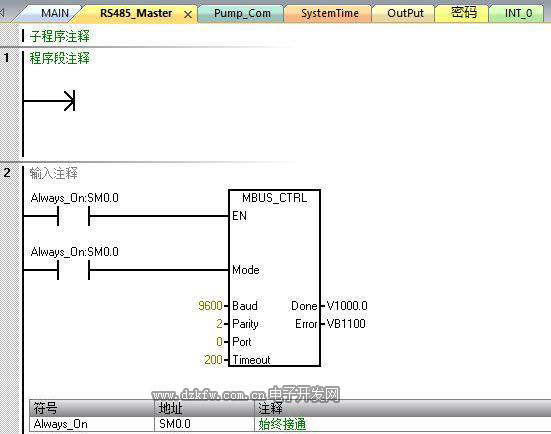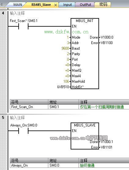 從站程序比較簡單,因為只是作為遠程操作站來處理。人不用跑到主站那邊去操作,在從站的屏上直接可以遠控主站設備。所以那些控制位都是在屏上的按鈕給的。采用的是按下為1,放開為0的形式。注意這里的初始化地址為從站自己的地址,等會在系統配置上能看到。這個跟主站程序上讀寫的站地址對應上了。