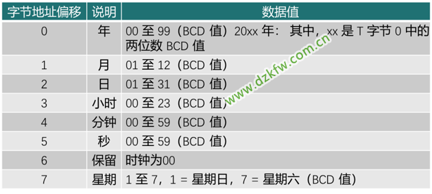 所有日期和時間值必須采用BCD格式(BCD碼通俗的說法是用16進制的形式來表示2進制數)分配(例如,16#12 代表2012年)。00至99的BCD值范圍可分配范圍為2000至2099的年份;時間緩沖區如圖2所示。