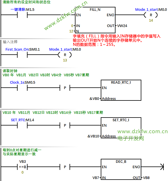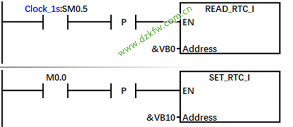 時鐘指令的管腳T就是緩沖區的起始字節地址,可以由用戶自由設置(在CPU允許的V存儲區范圍內)。如果設置T為VB10,那么讀取時鐘后,“年”的信息就會保存在VB10中,“月”保存在VB11中。