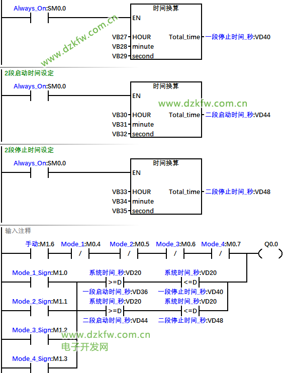 根據控制要求,我們首先需要讀取系統時鐘進行與設定時間進行比較,其次還需要在HMI上面設置不同時段的啟停時間;另外還需要設定不同的工作模式,便于操作員選擇不同的工作模式;